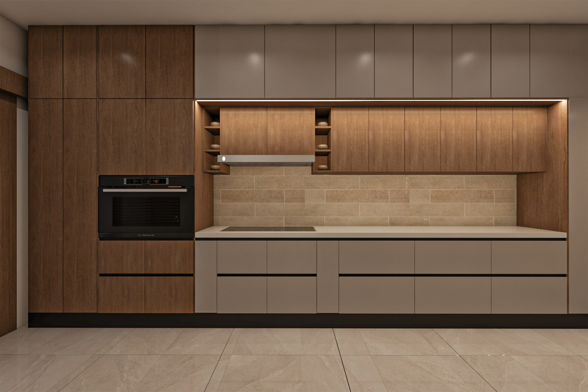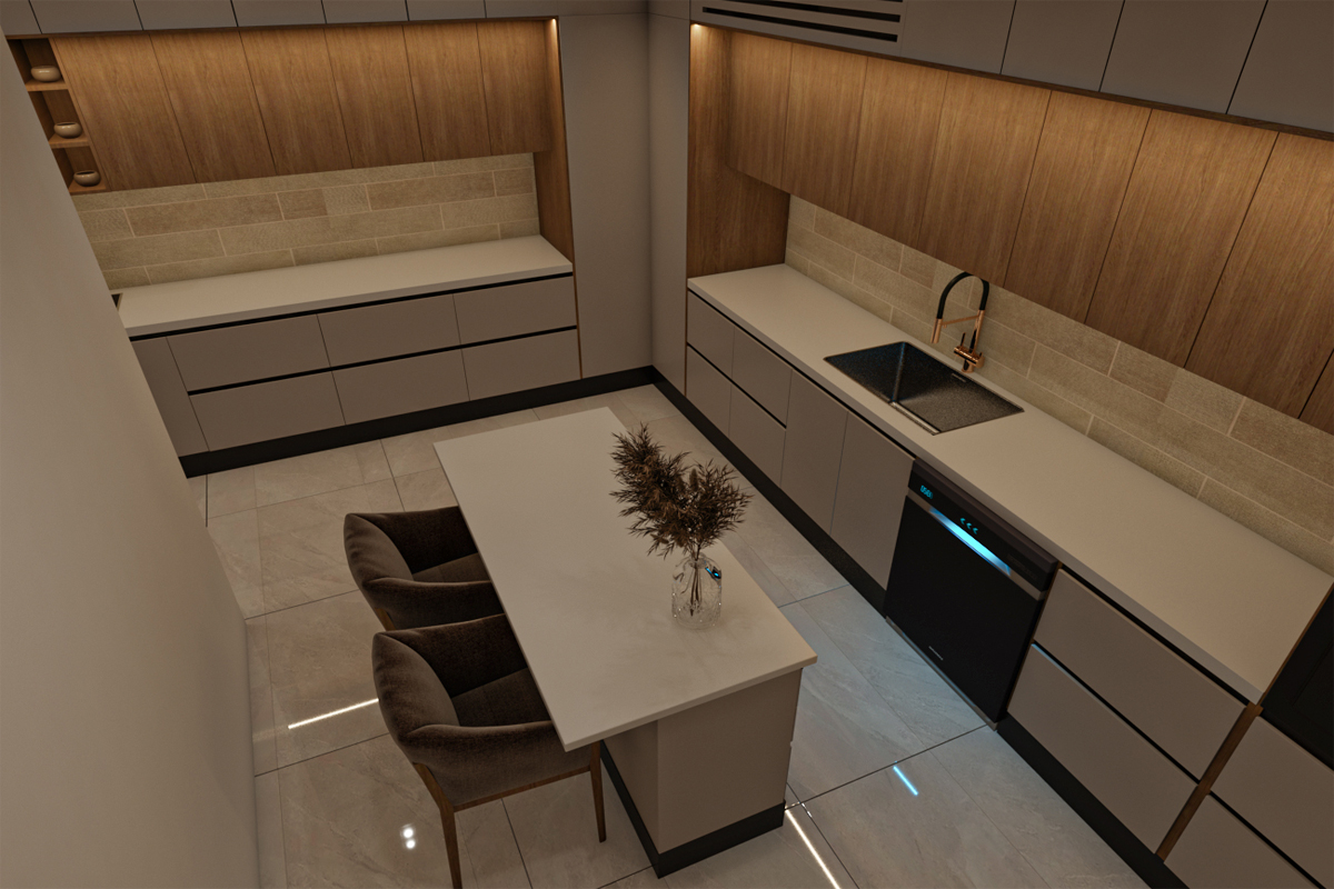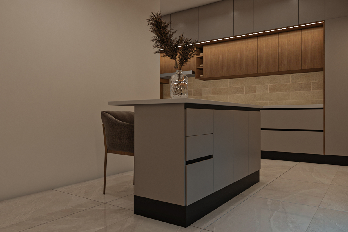 مطبخ بتصميم مودرن مع جزيرة – جريج*خشبي