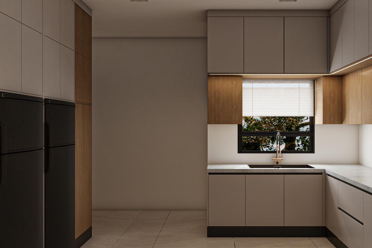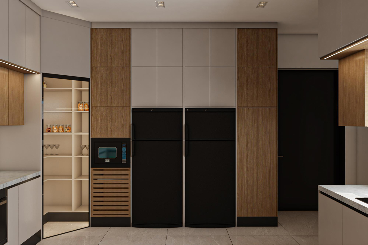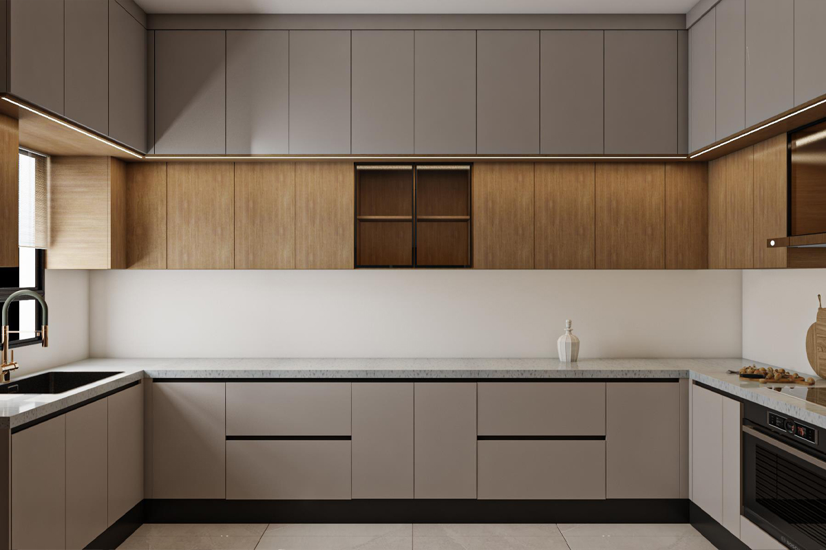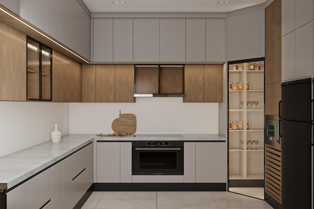 مطبخ بتصميم مودرن مدمج مع ركن تخزين زاوية – جريج*خشب الجوز